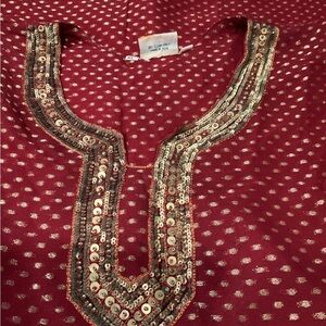 The dress is an A-line style and has a midi length, with beading, sequin, and side slits for added accents. It's made in India and comes in a burgundy color. This dress is a size XL and is suitable for regular size types. It's a great addition to any wardrobe and is sure to make you stand out.