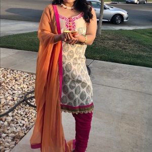 Top made of silk, bottom (chudidar) made of Cotton and orange dupatta made of chiffon