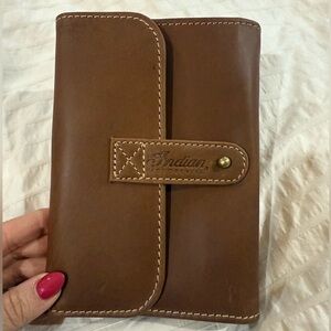Indian motorcycles tri fold tech wallet is genuine leather and in original packaging. It smells amazing. Perfect for stowing phone and accessories for a ride or travel.