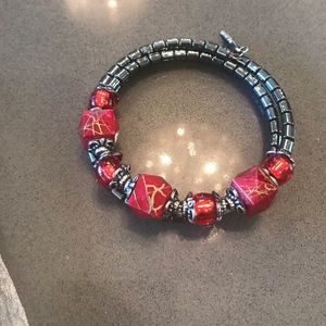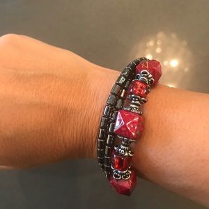 This gorgeous Indian necklace and bracelet set will make everyone turn! The perfect shade of burgundy and navy to spice up any outfit with beautiful rhinestone embellishments on the necklace, and beautiful detail on the bracelet. Brand new never worn, bracelet and necklace are both adjustable in size
