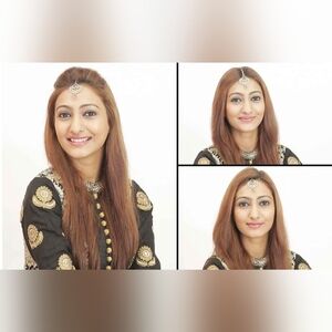 The item shown in the image is a Maang Tikka, a traditional Indian headpiece. This particular piece is gold-toned and features crystal/kundan stone work with a faux pearl drop.