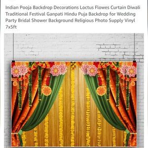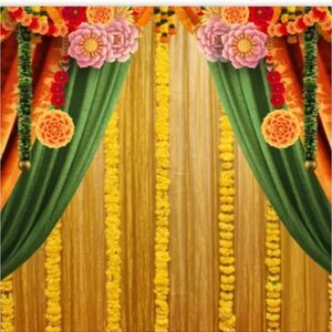 Vibrant floral festival backdrop featuring green and orange curtains. Perfect for celebrations and events.