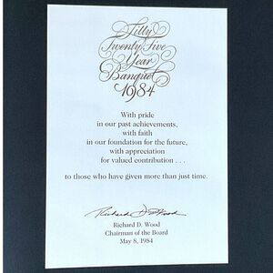 There is an internal Card inside the front cover from Richard D. Wood, Chairman of the Board noting the 25 year anniversary pledge to an employee.