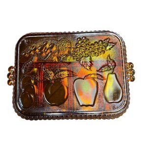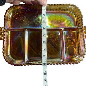 Beautiful Amber Indian glass tray that gets a rainbow effect under different light. The dish measures 9" x 12.5".