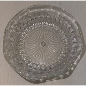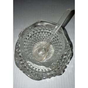 Indiana Glass Diamond Point Mayo/Sauce 3 Piece Set Bowl plastic Spoon Under Dish