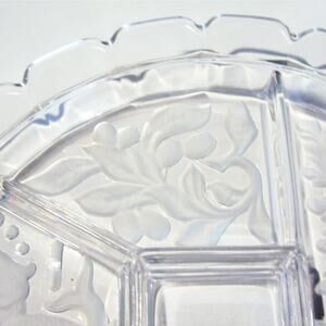 • Frosted Coi Fish, Figs/Olives, Tomatoes & Fleur de Lis Celery or Hearts Of Palm In The Centers Of 5-Way Divided Intaglio Glass And Large Sawtooth Edges
