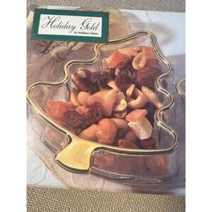 Set of 3 clear glass party dishes in the shapes of a tree, bell and star. Each bowl has a decorative gold trim around rims of bowls. This gold trim is darker than the picture on the box. It is a darker tone of gold--not as bright gold as picture. These are vintage from 1997. Great pre-owned condition. From estate sale.
