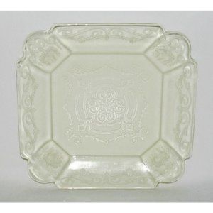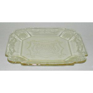 This is a nice yellow salad plate in the Lorain or Basket pattern. It was made by the Indiana Glass Co. from 1929 to 1932. It measures 7 3/4 inches across.