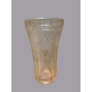 This Indiana Glass tumbler features the intricate Madrid pattern, reflecting its historical significance in the Depression Era. Its pink hue adds a touch of vintage charm to any collection or table setting. Ideal for collectors or those appreciating timeless glassware design.
