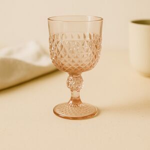 • Elegant vintage wine goblet from Indiana Glass in the coveted “Diamond Point” pressed-glass pattern, finished in soft rose-pink for timeless style.