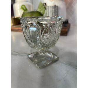Vintage Indiana Glass Co. “Pretzel” pattern footed sugar bowl. Clear pressed glass with diamond lattice design, scalloped rim, and looped handles.