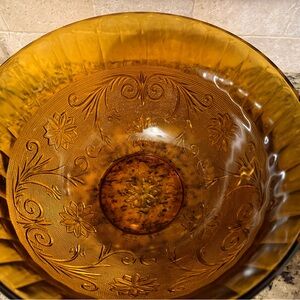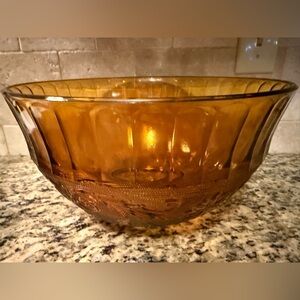 The bowl is made of amber-colored glass, a popular color for this pattern.