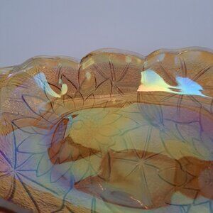 A charming vintage dish with intricate sunflower patterns, crafted from marigold carnival glass. Ideal for serving or decorative purposes.