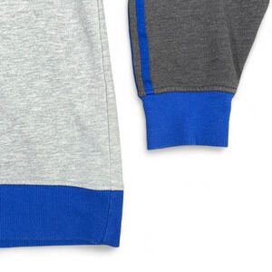 • Heather gray body (70% cotton, 30% polyester) with charcoal gray sleeves/shoulder (60% cotton, 40% polyester), and blue accents sweatshirt