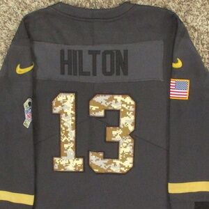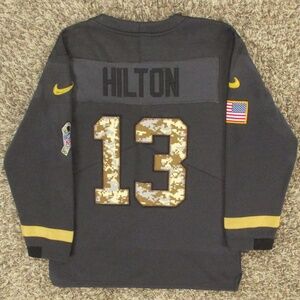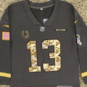 The Indianapolis Colts Sweater Boy's Large 14-16 Gray Camo NFL Fleece Embroidered Salute to service T.Y. Hilton # 13 is a comfortable and stylish way for young fans to show their team spirit. This sweatshirt features a classic crewneck design, a gray camo pattern, and the iconic Indianapolis Colts logo. The soft fleece material ensures warmth and comfort, making it perfect for game day or everyday wear