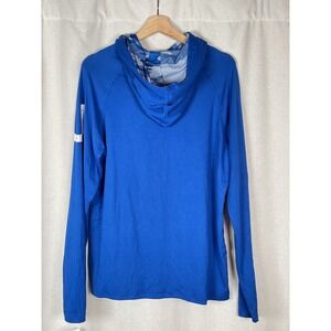 Stylish Indianapolis Colts long sleeve hoodie, perfect for showing team spirit. This royal blue hoodie features the team name and logo prominently displayed on the front, with a unique striped pattern inside the hood. The design includes a comfortable hood and long sleeves, making it ideal for layering or wearing on its own. A subtle Zubaz logo is also present. Great for game days, casual outings, or workouts, this hoodie combines comfort and team pride.