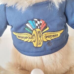 Soft sloth plush wearing a blue Indianapolis Motor Speedway shirt. Measures approx. 15" from head to toe with long arms and sewn facial features. Clean and gently used.