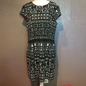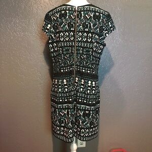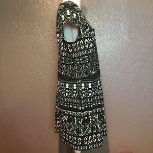 Indication Azteca or tribal design dress. Very cute and lightweight. Features a round neck and cap sleeve, pleats at the hip and pockets, long zipper in the back. Used but in excellent condition, no signs of wear. Measurements were taken flat and are approximate. 33.5 L, 9.5 neck opening, 21 5/8 armpit to armpit, 4 1/4 shoulder, 4 3/4 sleeve,20 bust and 18.5 waist.