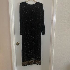 Indies Black & Gold Size 3 Maxi Dress Boho Chic Sheer Long Sleeves Slit In Back