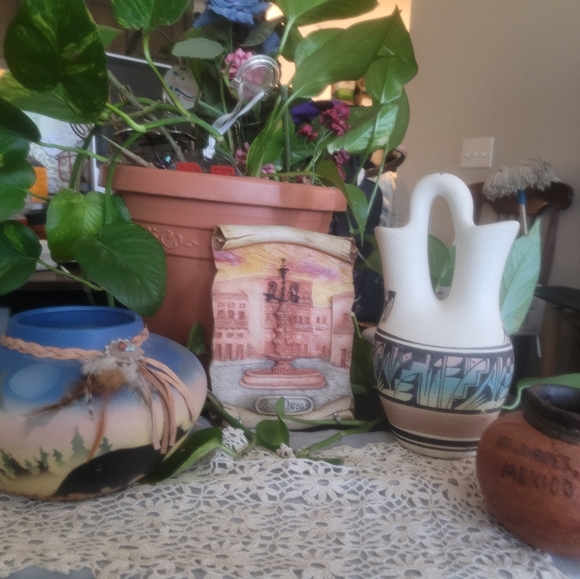 Mexico plaque with 2 key holders Mexico pot Southwest indigenous wedding pitcher Hand painted bowl $25 for collection