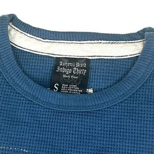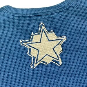 This long sleeve blue thermal t-shirt has a star in a crest printed on the front in a cream color. Around the edge of the star are silver rhinestones. On the back is centered the same star with silver rhinestones around the edges. Made by Indigo 30, this thermal tee is in good condition...no holes or stains. Very comfortable tee. Marked size "small".