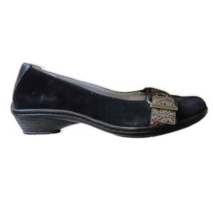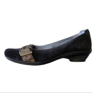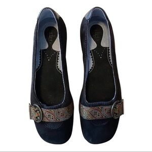Indigo Black Suede and Leather Tapestry Buckle Flats