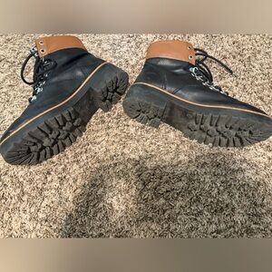 Stylish heeled boots by Indigo. Black leather with brown accents. Lace-up design. Perfect for any occasion.
