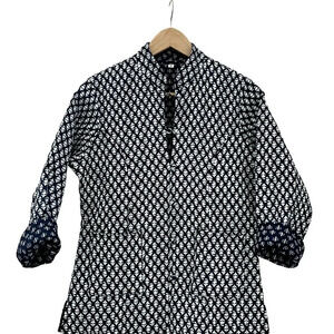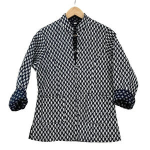 Super comfy blue indigo Polkadot Quilted Indian Block Printed Jacket with a boxy fit. Fabric is hand-block printed in the famous pink city of Jaipur, Rajasthan, India. Hand-made with full organic cotton and organic cotton wadding/quilting inside. Finished with chevron-shaped stitching, matching block printed covered buttons, two pockets, and contrasting wood block printed back and cream striped lining. Hips have 3" slit on both sides. Easy to wash in the machine on a cold wash and no need to iron.