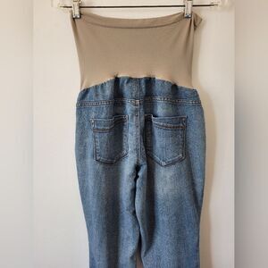 Perfect casual comfy maternity jeans, stretchy light wash denim with a full panel belly band. Good condition. Size small, measures approximately 44 inches long 33 inch waist 29 inseam.
