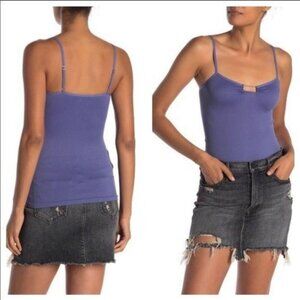 Indigo Free People Cami. Curved neckline with rectangular wire center cut out. Adjustable straps, stretch fit, seamless design, measures approximately 23” in length. Material: 92% nylon, 8% spandex. NWT