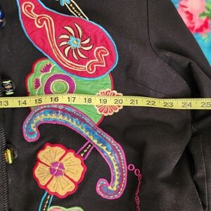 Vintage Indigo Moon black jacket with vibrant embroidery. Features floral and paisley patterns in bright colors. I love this cozy cute jacket 🥹 Excellent quality, buttons are glass beads, missing top button as pictured, but extra replacement button is on the inside of the jacket! 100% Cotton. Size 1x. Measurements pictured 🙂