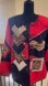 Stylish black AND RED jacket with intricate embroidery. Perfect for any occasion. PATCHWORK, COTTON RAYON AND LINEN BLEND, FULLY LINED, HAS WHIMSICAL PINWHEEL PAINTED WOODEN BUTTONS, THIN SHOULDER PADS, PRE OWNED IN EXCELLENT CONDITION.
