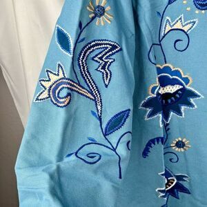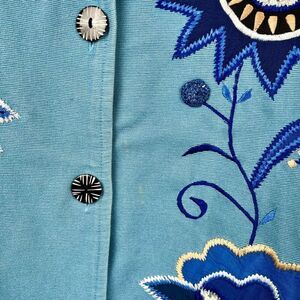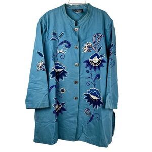 Indigo Moon Floral Button Up Long Jacket 3X. There is wear and tear on this jacket. There is a snag and some staining/fading/discoloration. Please see photos. Measurements in photos. In good, pre-loved condition. Comes from a smoke free home.