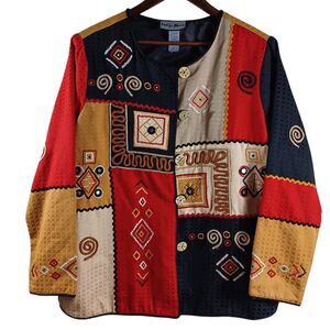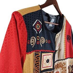 Step into art itself with this bold and beautiful embroidered jacket by Indigo Moon. Featuring a stunning patchwork design with geometric embroidery, this rare piece blends boho elegance with an art-gallery edge. Rich tones of crimson, navy, ochre, and cream give it a tapestry-like feel, while the decorative buttons and intricate stitching make it a wearable work of art. Fully lined and made with a cotton-rayon shell, it offers both structure and comfort.