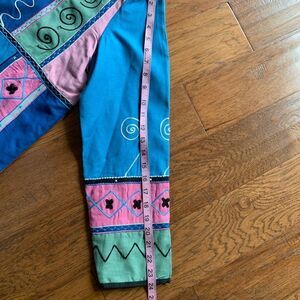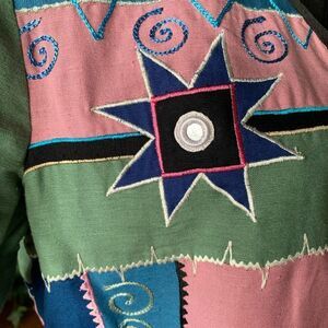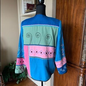 Fun colorful pastel jacket shoulder pads wearable art embroidery patches fully lined button closure great preloved condition smoke/pet free