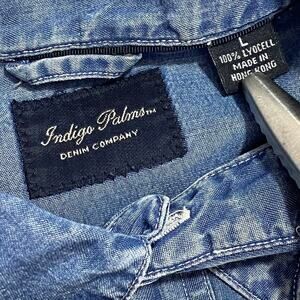 Classic short sleeve denim shirt from Indigo Palms by Tommy Bahama. Soft blue cotton with button-up front, detail buttons, and casual island styling. Tagged Large — see photos for measurements. Pre-owned, excellent condition with no flaws. Great for laid-back wear, resort style, or collectors. Fast shipping, trusted seller.