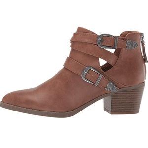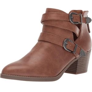 • Add little bad-girl inspiration to your fall wearing the faux-leather Indigo Rd.® Zarina pull-on bootie with buckle strap detail.