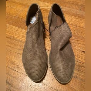 Light brown in color, zipper on the inside of the foot. Never worn.