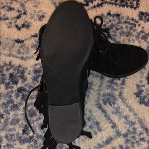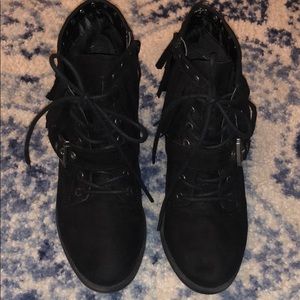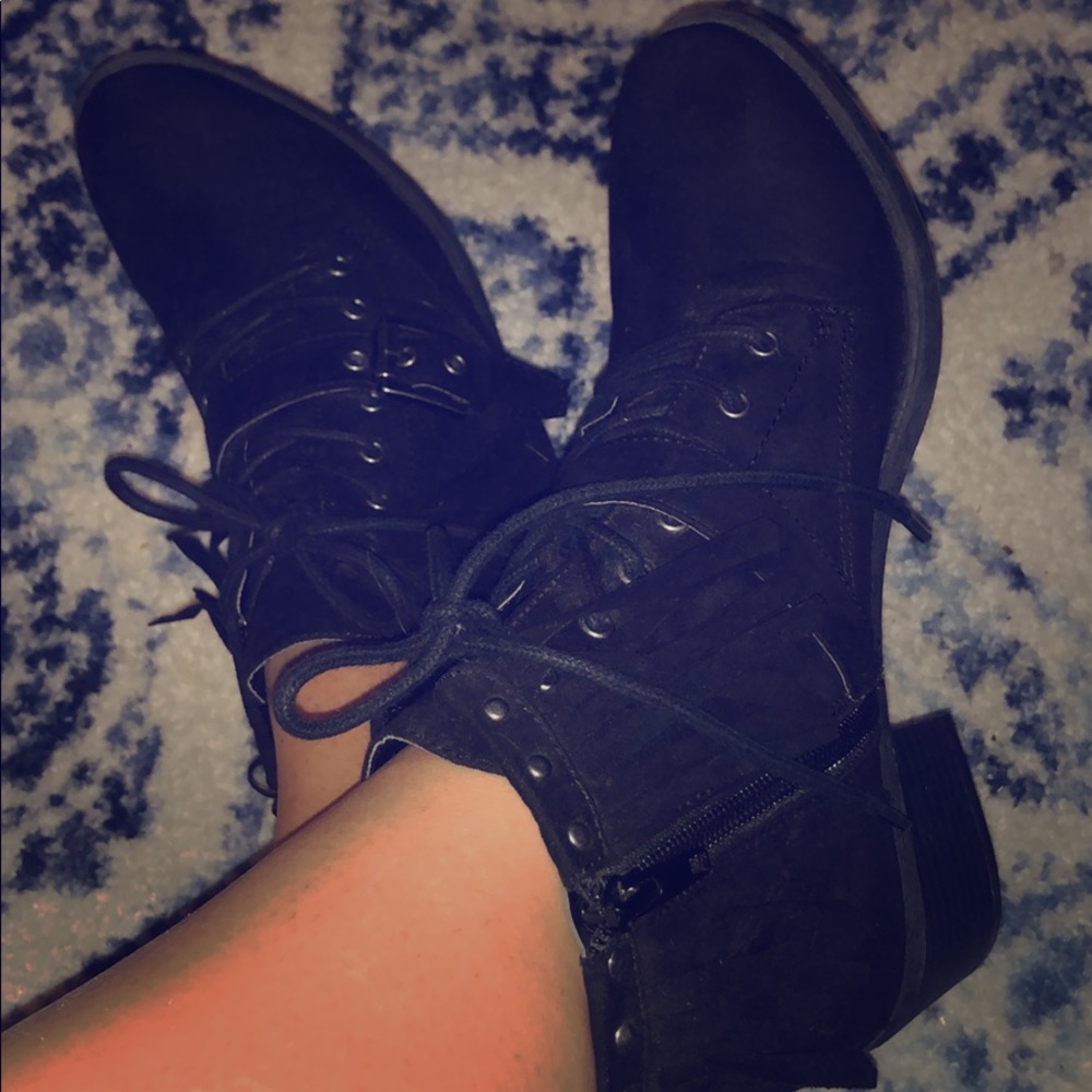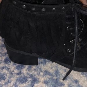 Super comfy faux suede black bootie with small heel built for long west. Silver buckle and embellishments and side zipper. Worn once and in new condition.