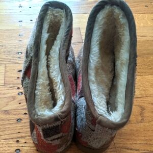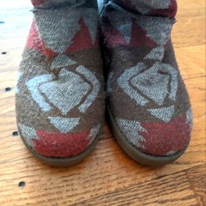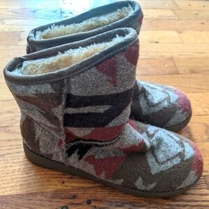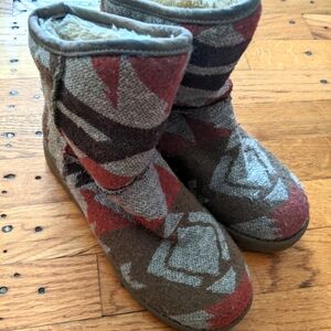 Brown, tan, and red patterned fabric ankle boots with warm, faux fur lining and thick rubber soles.