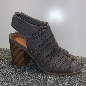 Indigo Rd. gray suede heeled sandal/ cut out bootie. Velcro ankle strap and beautiful triangle design on front of foot. Perfect for summer. Size 8.5.