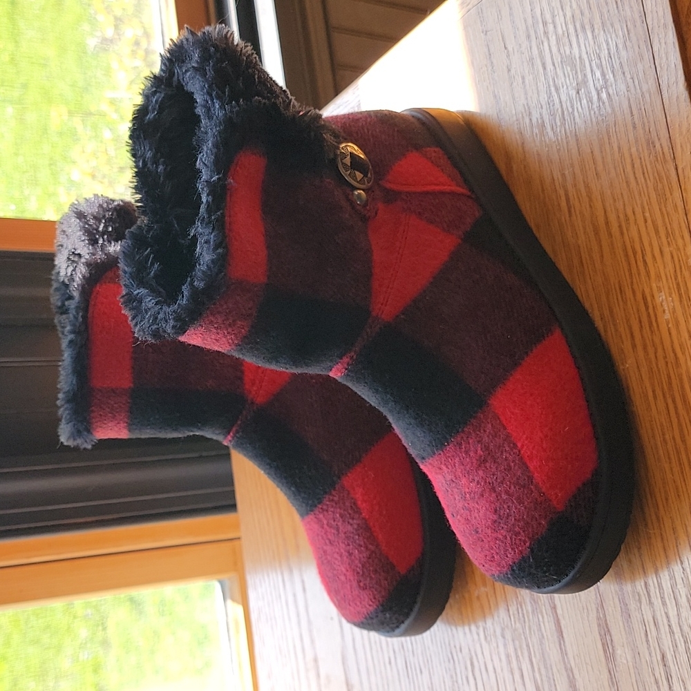 -red and black plaid pattern boots