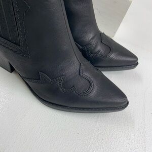 These Indigo Rein ankle booties feature a sleek black design with a pointed toe and elastic side panels for easy wear. The moderate stacked heel adds a touch of elegance, while the decorative stitching enhances the classic silhouette. Perfect for adding a stylish edge to any outfit.