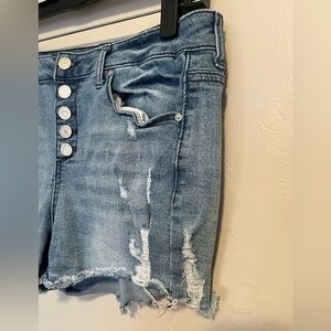 Trendy distressed jean shorts by Indigo Rein. Features button-up front and frayed hem. Perfect for casual wear.