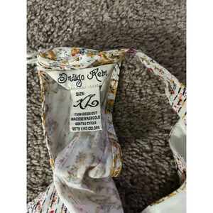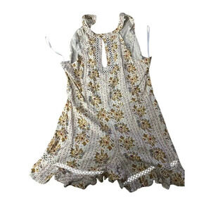 This Yellow Indigo Rein romper is a women's XL size featuring a multicolor floral pattern. Designed for casual summer wear, it has a halter neckline, crochet lace accents, and a ruffled hem. The one-piece style offers a regular fit with a keyhole detail. The item is pre-owned.