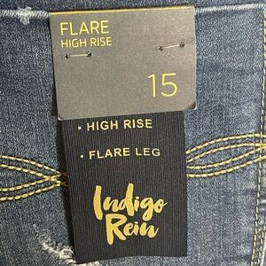 Brand new with tags Indigo Rein high rise flare jeans, size 15 (waist 31”, inseam 32.5”). Crafted from eco-conscious recycled denim that incorporates REPREVE® polyester made from two plastic bottles. Features include a button fly, flattering flare leg, and a medium blue wash with subtle fading. Made from a soft and stretchy blend of 68% cotton, 21% REPREVE® polyester, 9% rayon, and 2% spandex. Perfect for pairing with crop tops or tucked blouses for a retro-inspired silhouette.