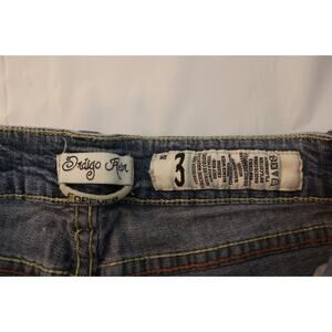 This is a pair of Indigo Rein Junior Blue Light Washed Stretch Distressed Skinny Jeans in size 3. The jeans feature a solid pattern with a mid-rise waist and a slim fit. They have a zipper and button closure, made of a cotton blend denim fabric with stretch for comfort. The distressed detailing adds a grunge aesthetic, suitable for a variety of styles including bohemian and city looks. The jeans are machine washable and have accents of buttons, zippers, and a logo.