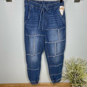 Indigo Rein Patchwork Contrast Denim Joggers Elastic Drawstring Waistband NWT Jeans Size Medium