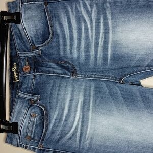 Indigo Rein Skinny Jeans with Plenty of Fading and Whiskering in Excellent Condition.