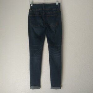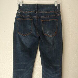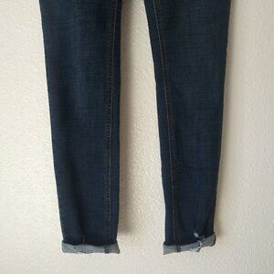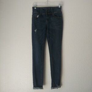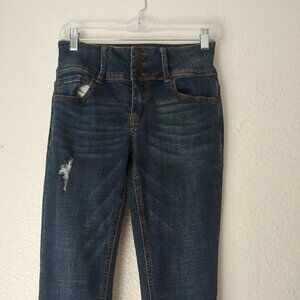 Indigo Rein dark wash distressed mid rise ankle jeans, 3 button closure, stretch